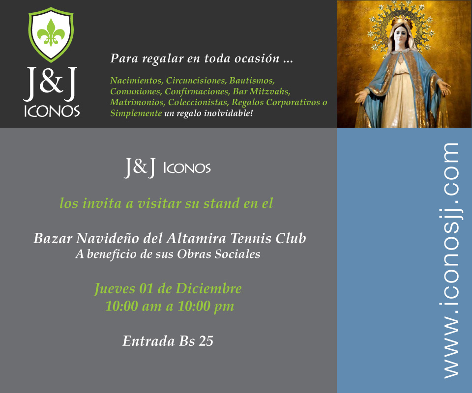 Bazar Navideño Bazar Navideño del Altamira Tennis Club Publicado por Iconos J&J el noviembre 28, 2011 J&J Iconos los invita a visitar su stand en el Bazar Navideño del Altamira Tennis Club A beneficio de sus Obras Sociales Jueves 01 de Diciembre 10:00 am a 10:00 pm Entrada Bs 25 Los esperamos! Jeannie & Jeanniffer Comparte esto: Compartir en WhatsApp (Se abre en una ventana nueva) WhatsApp Compartir en Telegram (Se abre en una ventana nueva) Telegram Comparte en Facebook (Se abre en una ventana nueva) Facebook Compartir en X (Se abre en una ventana nueva) X Haz clic en Pinterest (Se abre en una ventana nueva) Pinterest Compartir en Tumblr (Se abre en una ventana nueva) Tumblr Enviar un enlace a un amigo por correo electrónico (Se abre en una ventana nueva) Correo electrónico Imprimir (Se abre en una ventana nueva) Imprimir Me gusta Cargando... Relacionado