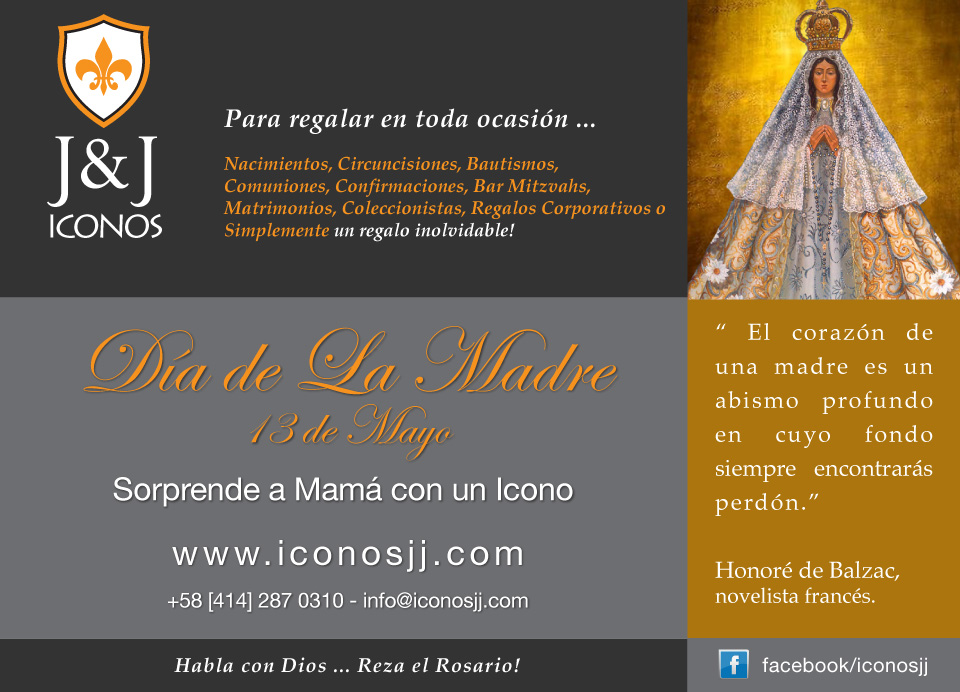 Regalar Día de la Madre – 13 de Mayo Publicado por Iconos J&J el mayo 3, 2012 Día de la Madre 13 de Mayo Sorprende a Mamá con un Icono! Visita nuestra Galería ::: +58 [414] 287 0310 info@iconosjj.com Comparte esto: Haz clic para compartir en WhatsApp (Se abre en una ventana nueva) WhatsApp Haz clic para compartir en Telegram (Se abre en una ventana nueva) Telegram Haz clic para compartir en Facebook (Se abre en una ventana nueva) Facebook Haz clic para compartir en X (Se abre en una ventana nueva) X Haz clic para compartir en Pinterest (Se abre en una ventana nueva) Pinterest Haz clic para compartir en Tumblr (Se abre en una ventana nueva) Tumblr Haz clic para enviar un enlace por correo electrónico a un amigo (Se abre en una ventana nueva) Correo electrónico Haz clic para imprimir (Se abre en una ventana nueva) Imprimir Me gusta Cargando... Relacionado